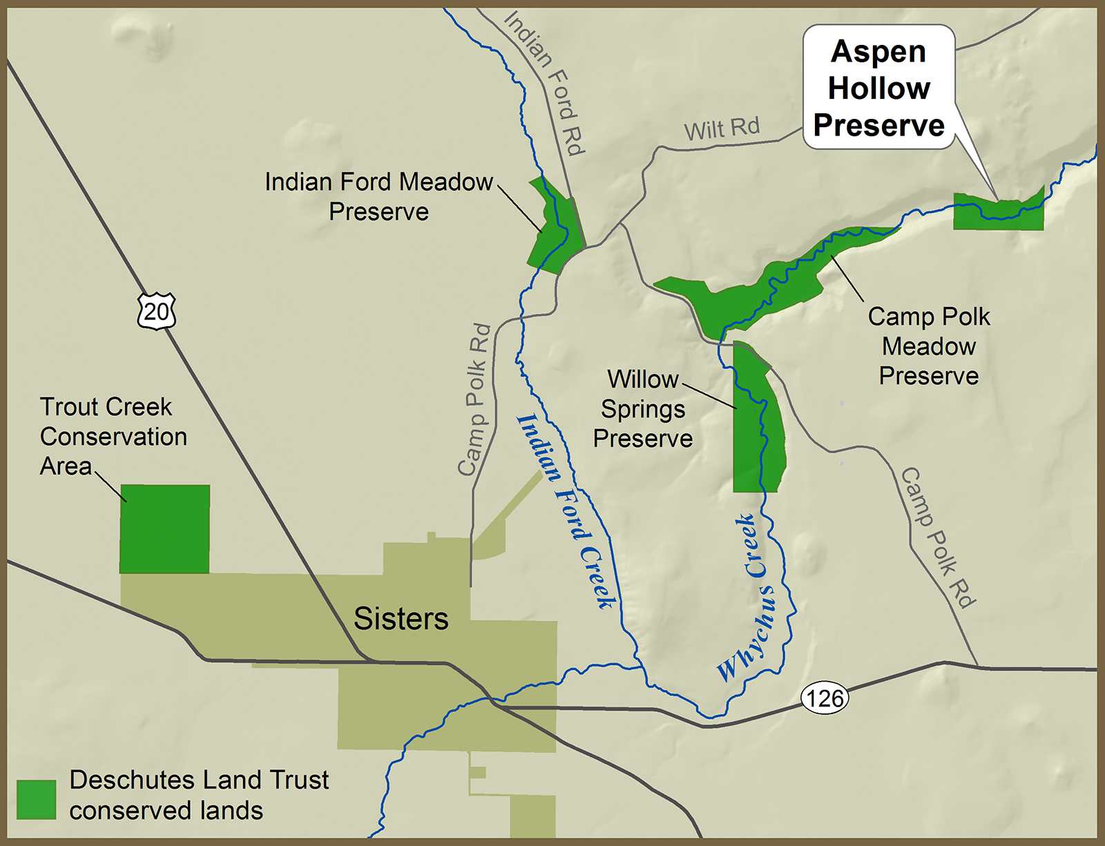 The Land Trust acquired and protected the 58 acre Aspen Hollow Preserve in 2015. The Preserve includes 1/2 mile of Whychus Creek, rimrock cliffs, as well as pine and aspen stands, and is located outside of Sisters, Oregon (see map below). Aspen Hollow Preserve is home to a host of wildlife species including salmon and steelhead, mule deer, rocky mountain elk, golden eagles, spotted bat and numerous songbirds.