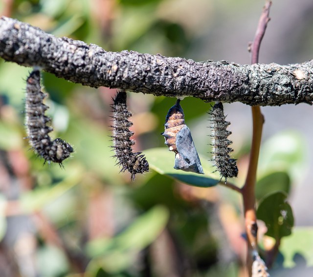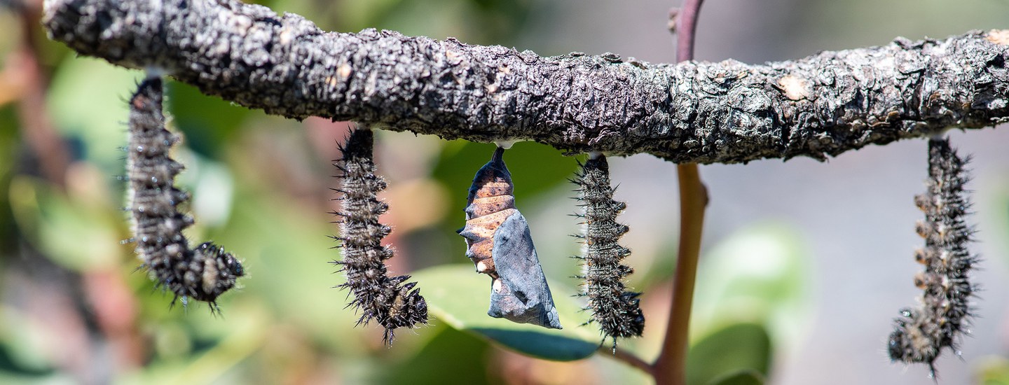 The first sign that a caterpillar is going to form a chrysalis is when they form a "J hook." They attach themselves with their silk to their chosen branch and shape their body into a J shape. They then begin their transformative journey into a chrysalis. After forming chrysalides, the California Tortoiseshells take a week or two to transform into butterflies!