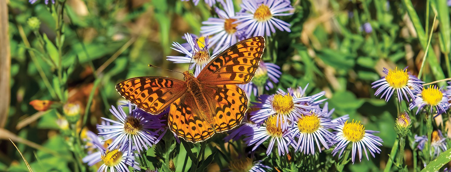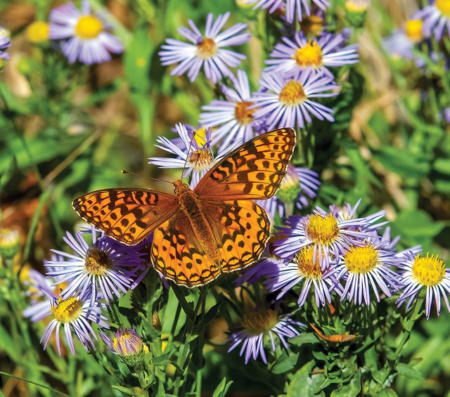 Look for this medium-sized bright orange butterfly with black wing margins and black spots. Often confused with monarch butterflies (also orange and black), but without the crisp windowpanes. Look for them on trails where they frequently “puddle” sipping salts and minerals from damp soil, or find them swarming by the hundreds, or even thousands, each summer in the mountains.