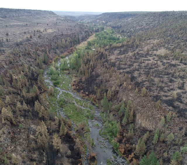 As a scientist, I’m keenly aware that Central Oregon has evolved with fire, and ultimately this fire would likely benefit some species. But that still didn’t mean that I wasn’t worried about our restoration areas. Once staff were able to get into Rimrock Ranch and Whychus Canyon Preserve, I was thrilled to see that the stream restoration areas were ok! The green valley floor with Whychus Creek winding through it was still there with minimal burned vegetation. In general at Rimrock Ranch, the fire did not penetrate into vegetation in the valley floor where surface water was near the edges of the valley. The same was true in the 2016 restoration area at Whychus Canyon Preserve. However, at Whychus Canyon Preserve, the streamside vegetation in unrestored areas and within restored areas with only one channel of stream flow did burn and carry fire. Thus, surface water connectivity via multiple habitat types (e.g. side channels, wetlands, and large pools) within the floodplain appeared to be the factor that created a fire break. I wasn’t surprised that some of the floodplain that contained surface water remained unburned, but what did surprise me was how quickly fire appeared to stop. For example, some streamside vegetation of mixed height along the edges of the valley burned, so intuitively one would think that fire would carry through the canopy of surrounding vegetation out into the valley floor. Generally, that did not happen.