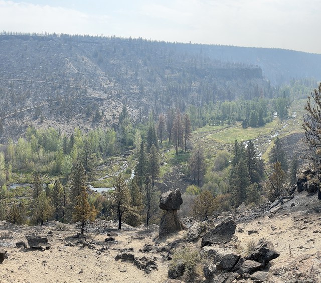 - Whychus Canyon Preserve: significant portions of the Preserve burned. Initial reports suggest that the burn was patchy, with some places burning hotter than others. The unrestored portion of Whychus Creek in the canyon appears to have burned hot. We have yet to get reports on the northernmost section of the Preserve where we restored Whychus Creek in 2016. Trailhead impacts have been moderate so far, and we were pleased to hear our trailhead kiosk survived! Given the fire, Whychus Canyon Preserve is currently closed to all use.