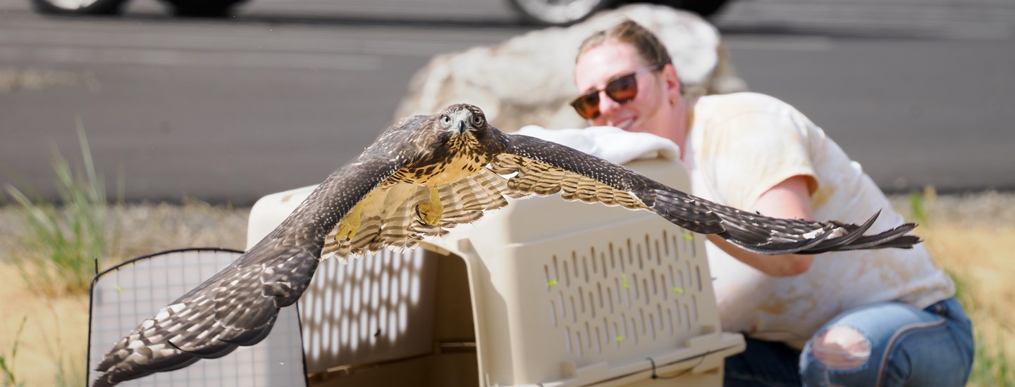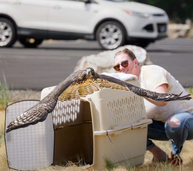 A few weeks after intake, the hawk was ready for final assessments. A key milestone to determine whether the red-tailed hawk was ready for release was confirming their ability to catch and consume live mice without assistance. Once they passed this and other final assessments, both hawks were considered fully rehabilitated.
