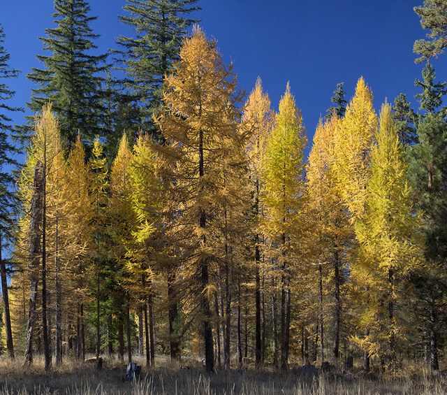In the natural world, Western larch is one of the first species to move in after a disturbance like a fire. It’s thick bark, deep roots, lack of lower limbs, and needles with high moisture content help it survive the regular low-intensity fires that occur in our region. Once Western larch move in, they help pave the way for more shade loving species that grow under them. A wide variety of wildlife use the resources the Western larch offers. Rodents and squirrels eat its seeds, birds look for insects and nest in its branches, deer and elk will browse on its needles, and bears eat its sweet sap in spring. Flying squirrels, woodpeckers, owls and other species will also nest in holes in the tree, and raptors will nest in the larch when it becomes a snag—a dead standing tree—later in life.