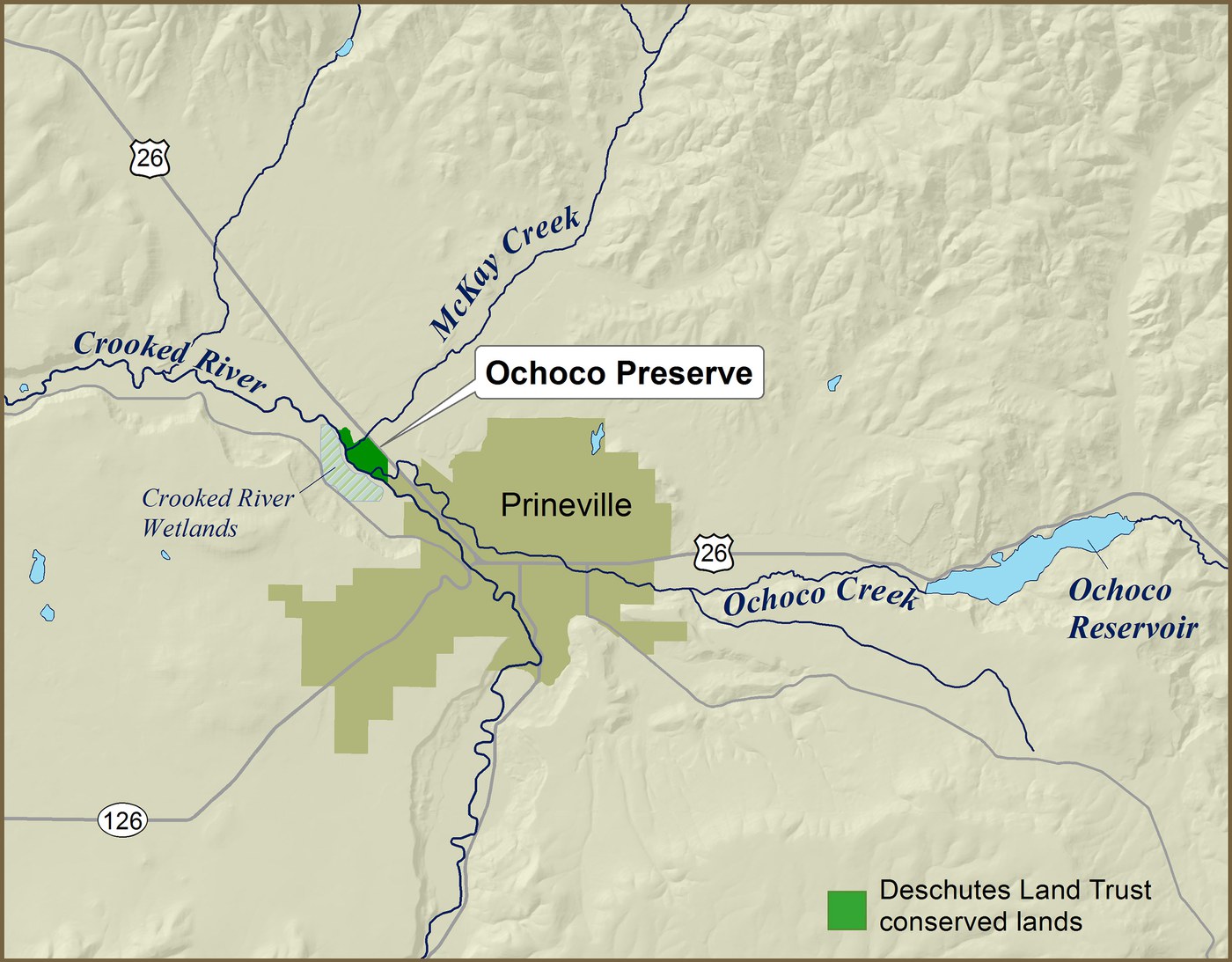 The map below shows the location of Ochoco Preserve. Access to Ochoco Preserve is currently limited to guided Land Trust tours and hosted educational offerings.