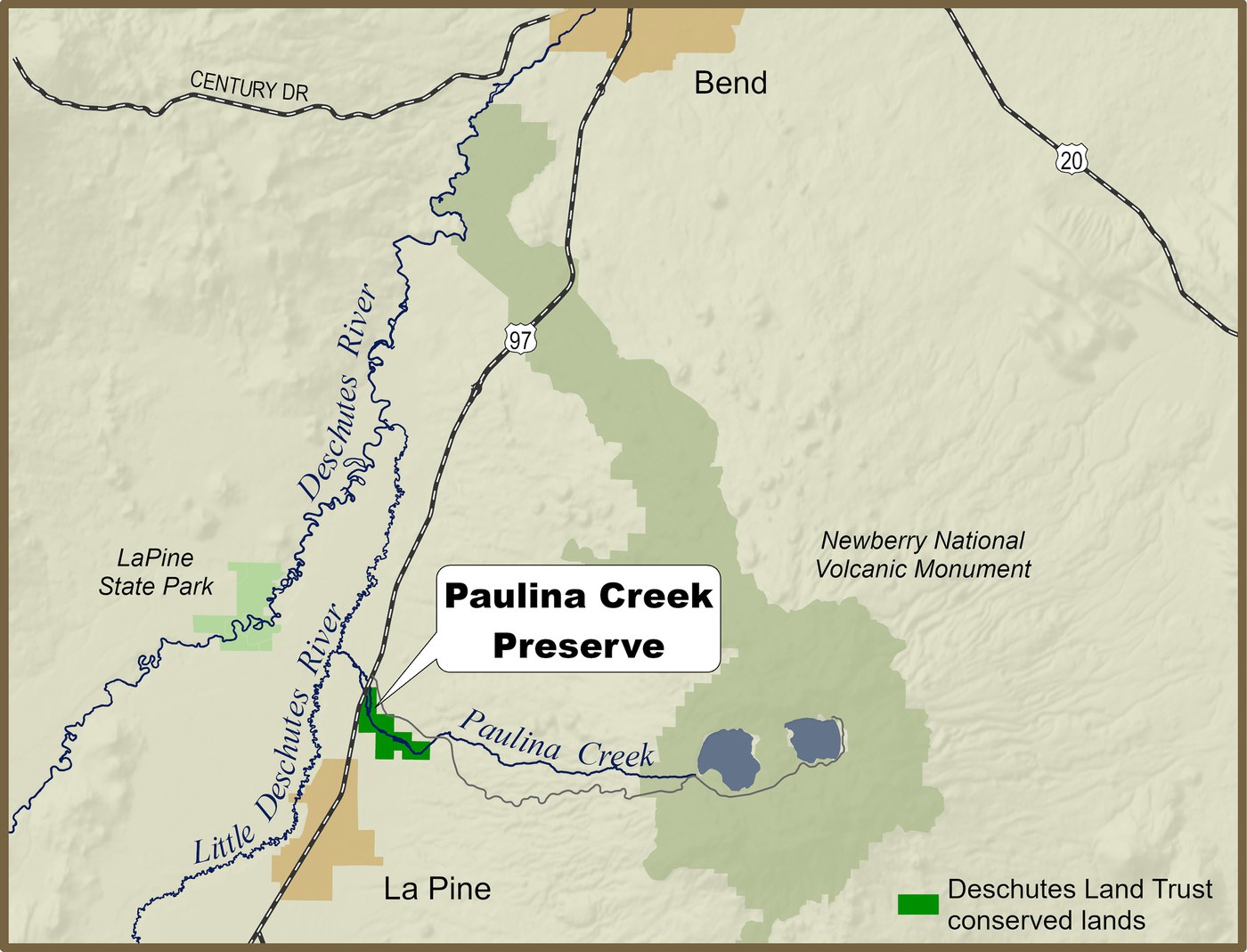 Please note: Paulina Creek Preserve is private property owned by Deschutes Land Trust. Your use of the property is conditional upon these and any other posted rules. Preserve users failing to observe posted rules are trespassing and subject to applicable laws and penalties. Visitors to the Preserve may encounter risks associated with terrain, wildlife, and weather. Please exercise appropriate caution: the Deschutes Land Trust is not liable for injuries to Preserve visitors.