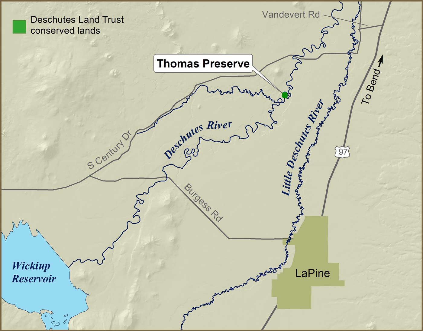 The Thomas Preserve was donated to the Land Trust by Carla Thomas in 2001. Located downstream from LaPine State Park and before the Big River takeout, the Preserve contains both dry land and wetlands and is within a Federal Wild and Scenic Waterway and State Scenic Waterway.