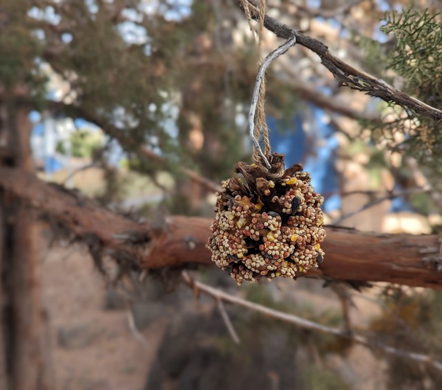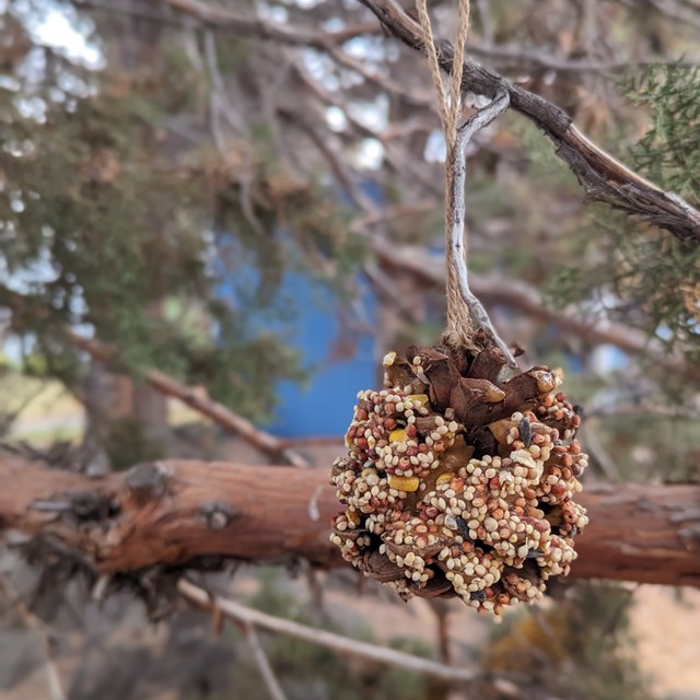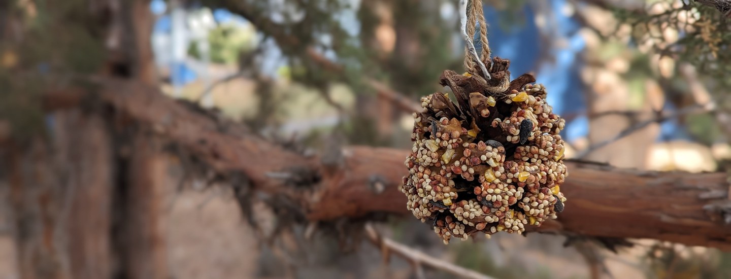 6. Lastly, carry your completed ornaments out to your yard and hang them on trees or shrubs of your choice. It can take a few days for the birds to catch wind of the new snacks, so check back often.