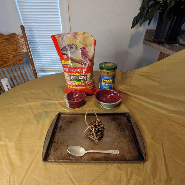 Pour your birdseed and peanut butter into their own bowls. I don’t recommend using the peanut butter straight from the jar because you run the risk of eating bird seed the next time you make a peanut butter and jelly sandwich.