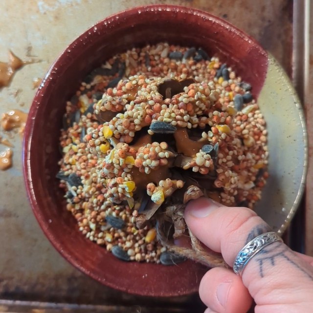 5. Fifth, take your now-covered pine cone and roll it along its side in your bowl of birdseed. Do this as many times as necessary to get your pine cone coated. Once done, set your completed ornament in your Tupperware or on your baking sheet for easy transport.