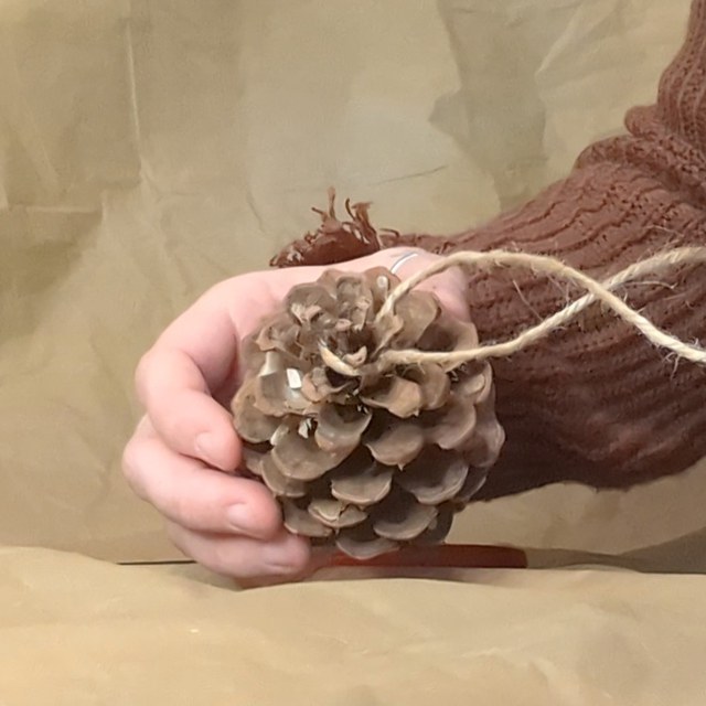 2. Second, tie your short piece of twine around the top of the pine cone - around 6-8 inches long. I find it’s better to do this now so you have a clean place to hold your ornament once it’s covered in peanut butter.
