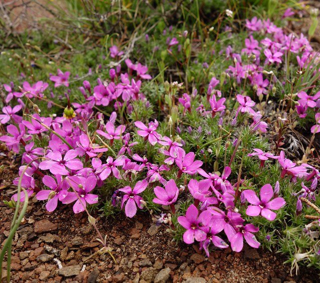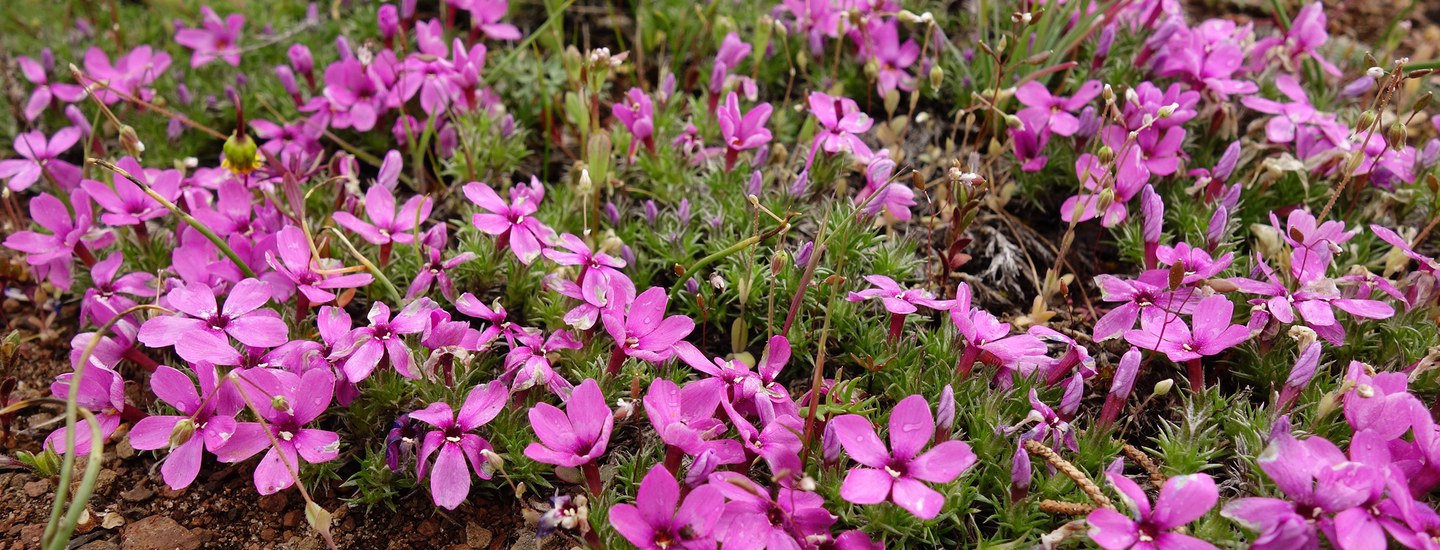 This low-growing flower prefers rocky crevices and exposed locations. These beauties always astound with their pop of color—flowers have five pink-purple-white petals (and can often be neon pink!). Adapted to extreme environments, cushion-like plants like phlox often have taproots 8-15' deep!