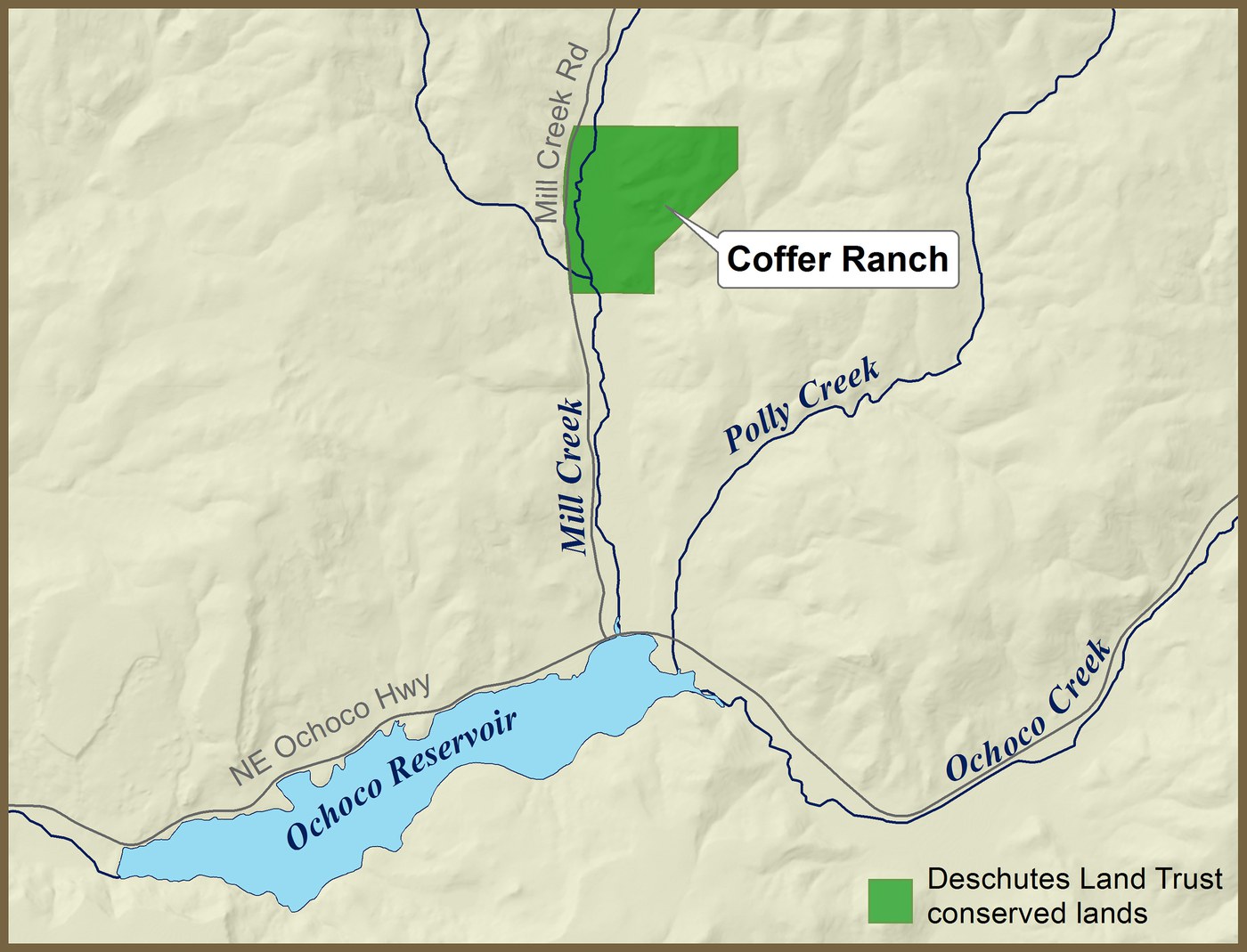 Coffer Ranch is a large ranch in the Mill Creek valley east of Prineville, Oregon. The Land Trust worked with the owners of Coffer Ranch in 2010 to permanently protect 492 acres of this ranchland and its important wildlife habitat.