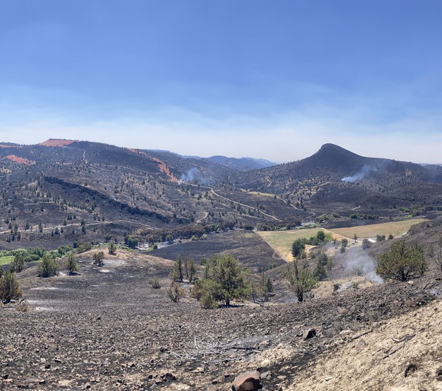 The impacts of the fire on Priday Ranch were extensive. Our current estimates are that at least 75% of the nearly 5,000 acres owned by the Land Trust has burned. Thanks to the efforts of firefighters and Land Trust staff, the structures on the property were saved and important habitat along Trout Creek remains intact.