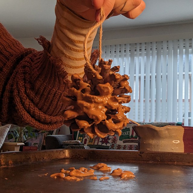 4. Fourth, using a spoon or butter knife, spread the peanut butter over the entire pine cone. Anywhere the peanut butter goes is where your birdseed will stick, so be sure to get the peanut butter between the open spines of the pine cone.